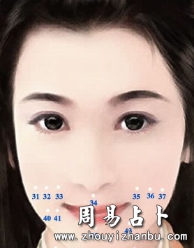 34 双生。为生双胞胎之相。一生多为体弱多病的儿女操心。子宫易有毛病,对健康运、夫妻运、财运,都是不好。