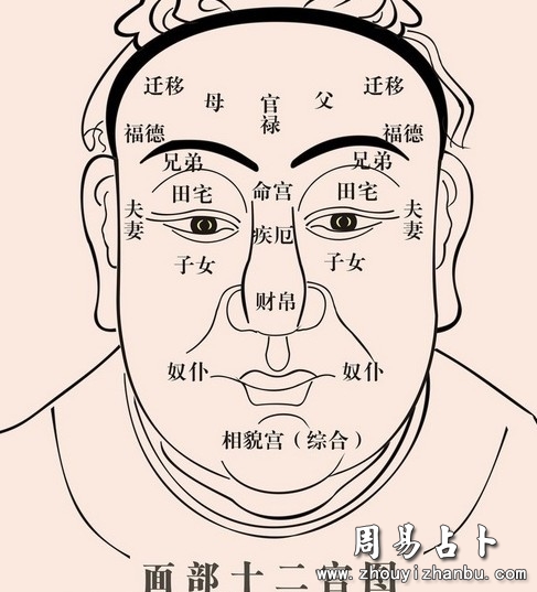 横向观看人的面部,古人将它分成十二宫,即命宫、财帛宫、兄弟宫、田宅宫、男女宫、奴仆宫、妻妾宫、疾厄宫、迁移宫、官禄宫、福德宫、父母宫。还附有相貌宫。
