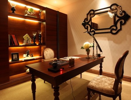 (3)书房中的家具宜用深色、如粟色、深褐色、铁红色等端庄、凝练、厚重、质朴的色调,这样的色彩能够稳定人们的情绪,有利于思考。